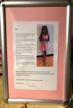 Priska veranlasste, an ihrem 60. Geburtstagsfest am 21. Dezember 2022, ein Foto von Bia aufzustellen um Geld für sie und ihre Familie zu sammeln. Zweck der Sammelaktion war es, dass Bia die Schule besuchen kann und später auch ihr kleiner Bruder und ihre kleine Schwester, aber natürlich auch alle anderen Kinder, die wir dort getroffen haben.